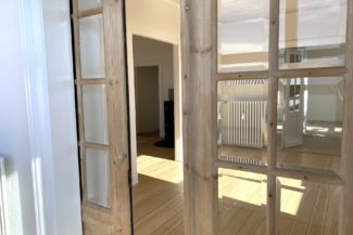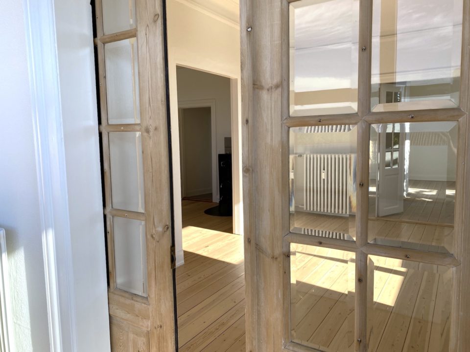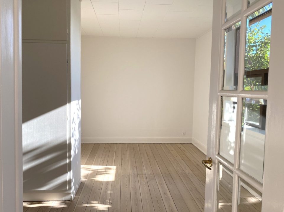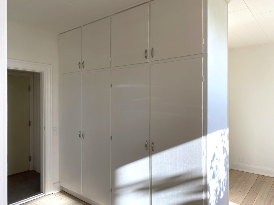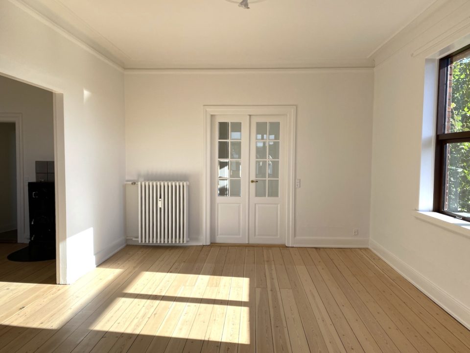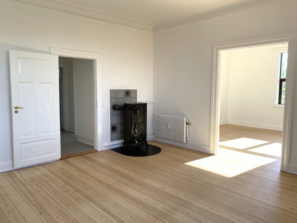 Man ankommer fra opgangen til lejlighedens fordelingsentré, en entré med rigtig god skabsplads. Fra fordelingsgangen er der adgang til lejlighedens store stuer en suite, den ene med flot gammel brændeovn. Fra den anden stue er der udgang til skøn og lys karnap/udestue. Det store lyse soveværelse har indbygget skabsvæg.