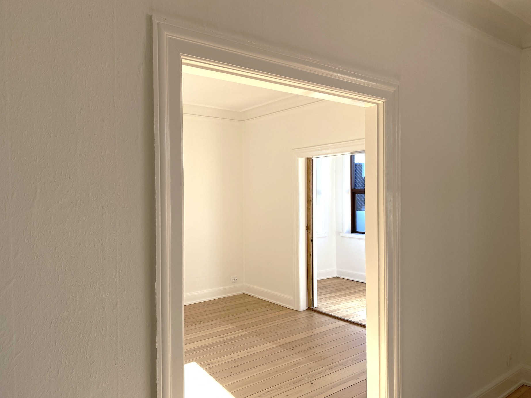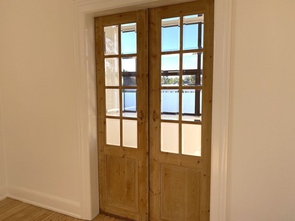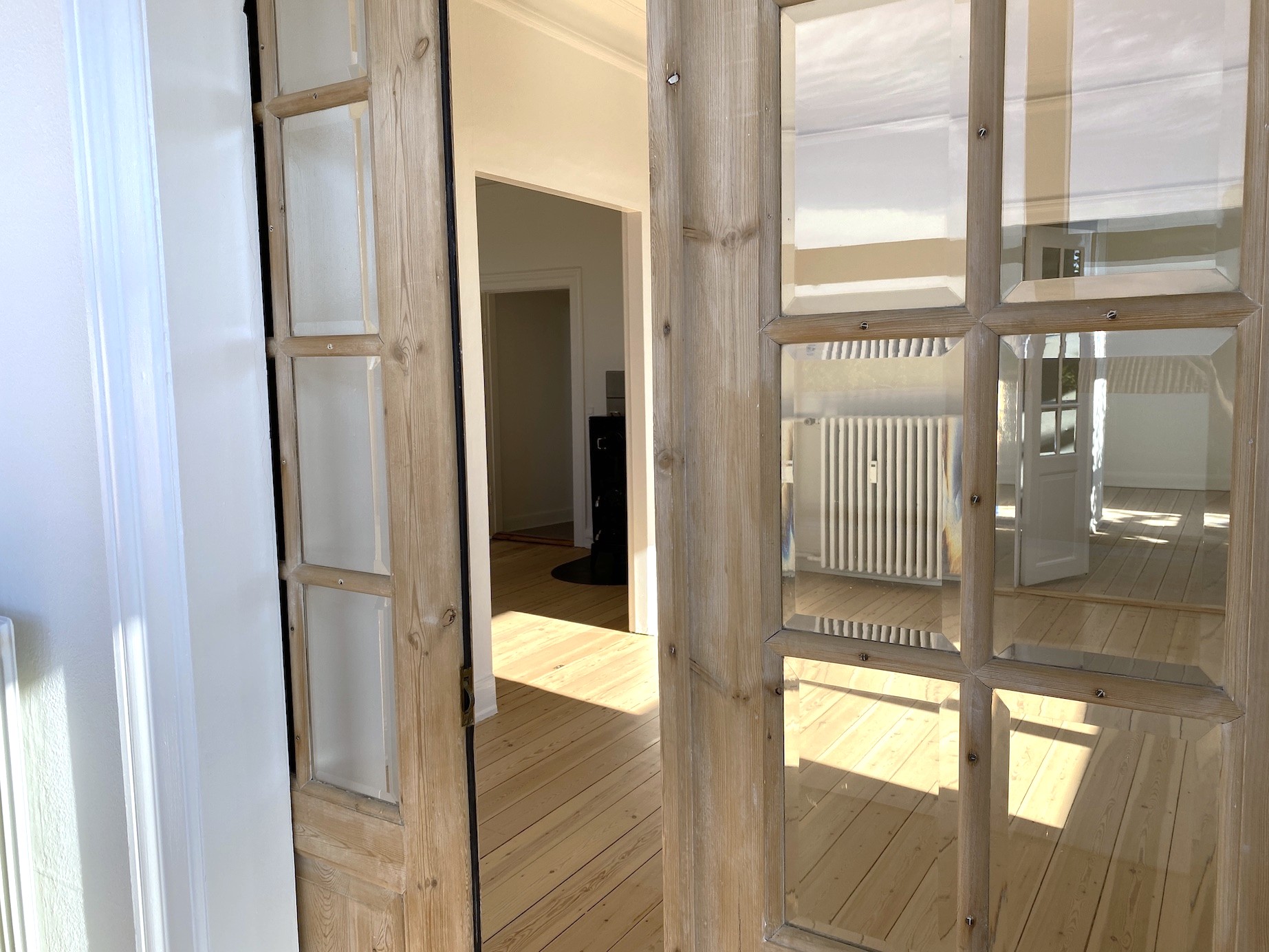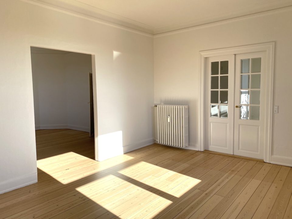 Man ankommer fra opgangen til lejlighedens fordelingsentré, en entré med rigtig god skabsplads. Fra fordelingsgangen er der adgang til lejlighedens store stuer en suite, den ene med flot gammel brændeovn. Fra den anden stue er der udgang til skøn og lys karnap/udestue. Det store lyse soveværelse har indbygget skabsvæg.